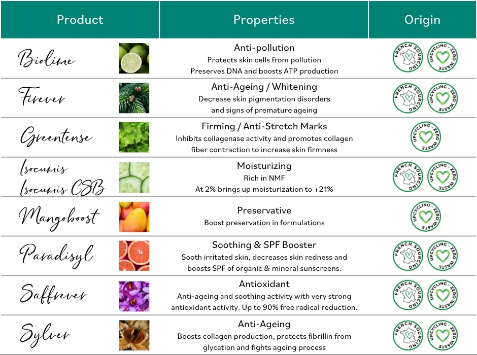 A versatile range of vegetable oils and waters—natural botanical extracts designed to deliver a variety of active properties for beauty and personal care formulations. Each ingredient is thoughtfully sourced from upcycled plant materials, supporting sustainability and responsible innovation.